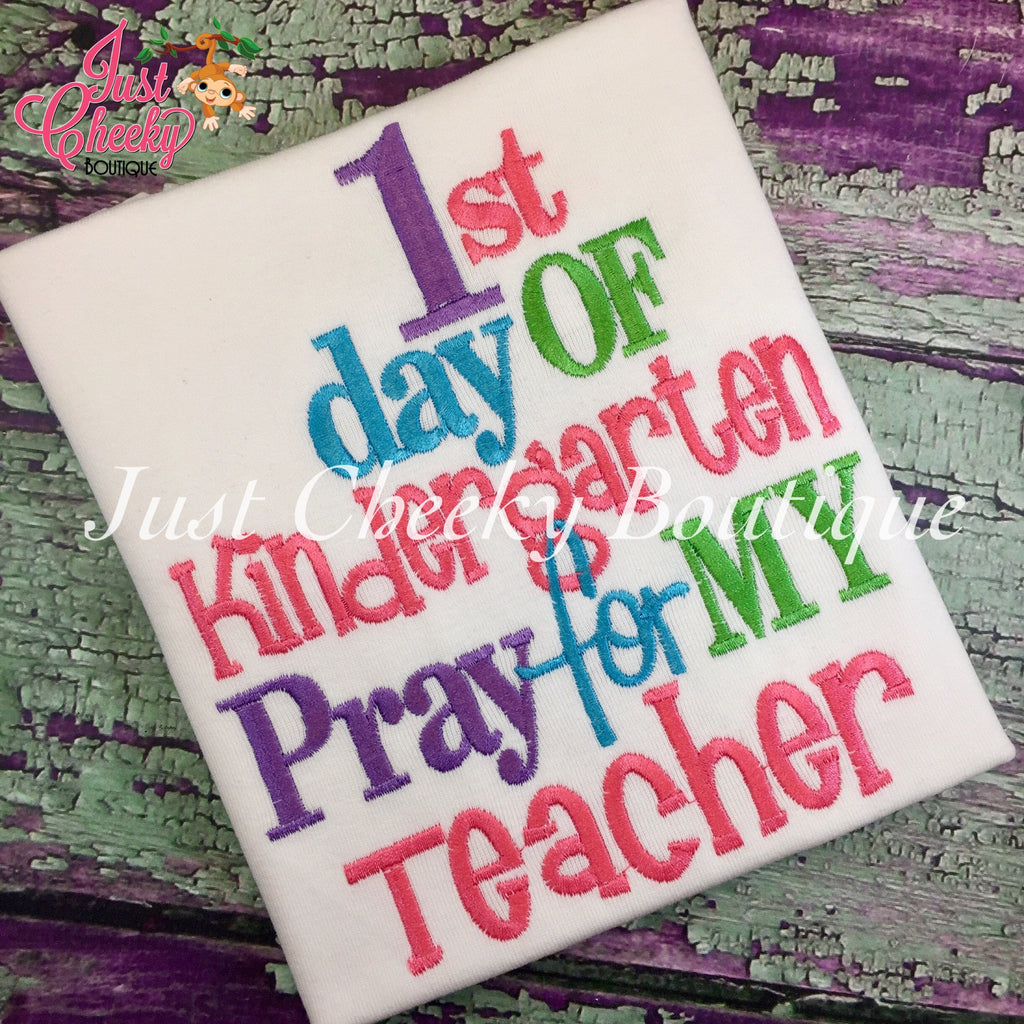 This listing is for a custom embroidered shirt with the phrase "1st Day of Pre-K, Pray for my Teacher".